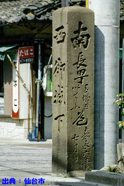 (正面右端)「右ハ 大蔵通、(同左端)「左ハ 愛子通」/正面中央に「南無阿彌陀