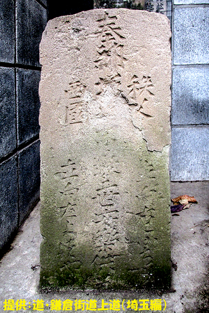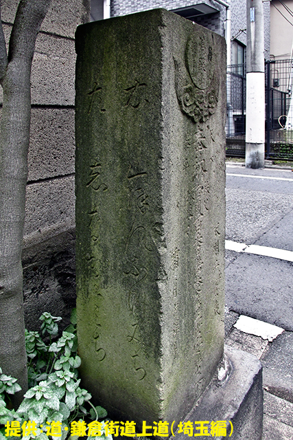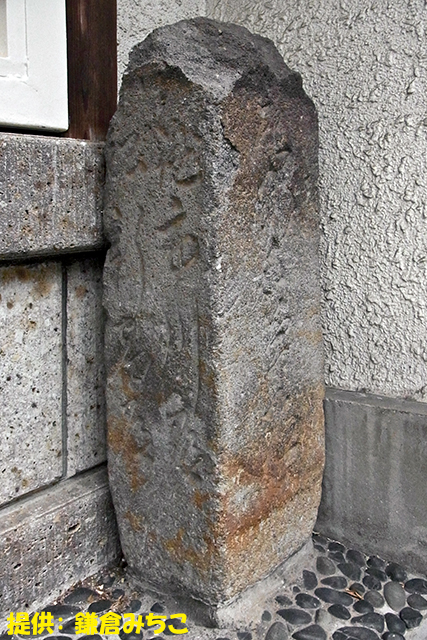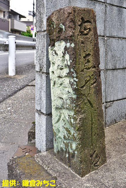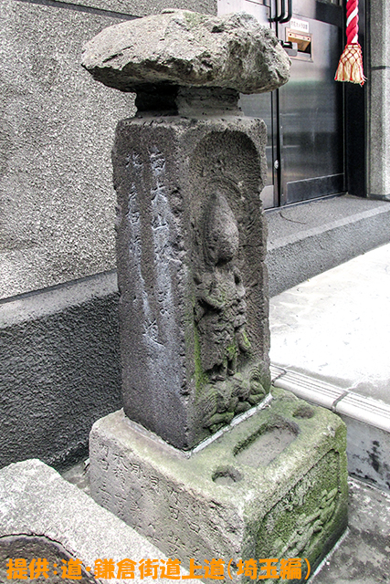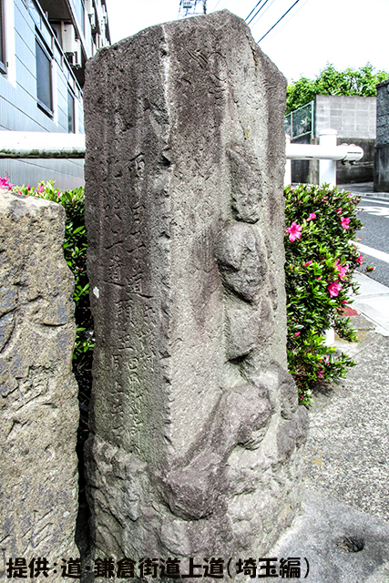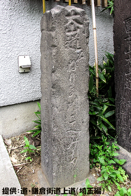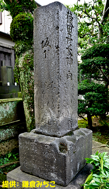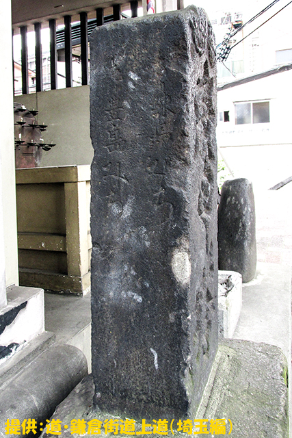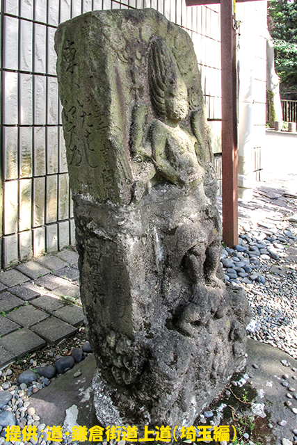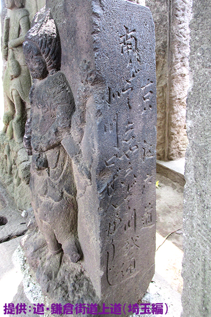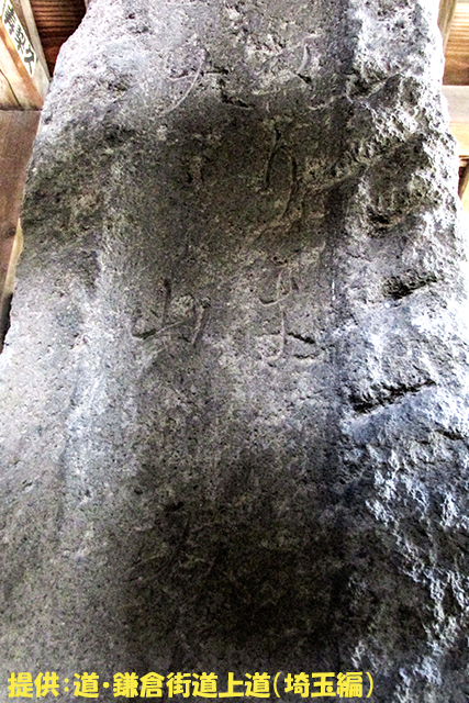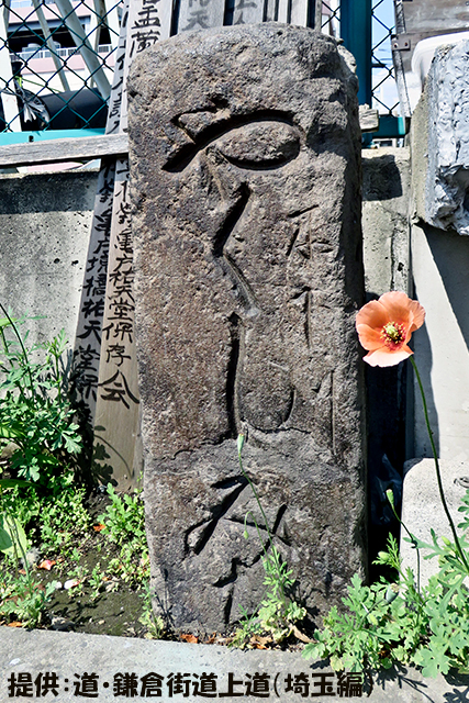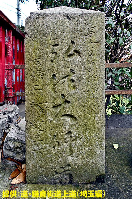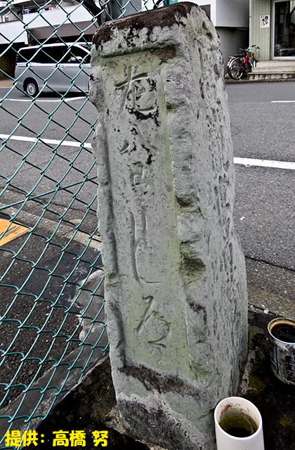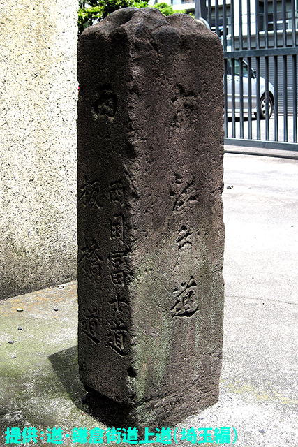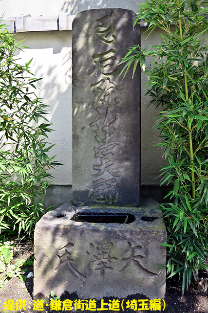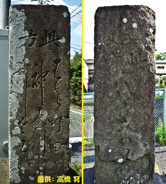 (正面像下右)「是ゟ…」、(同左)「不動院ヘヨシ」/正面上部にとぐろを巻いた蛇(弁財天の化身)の浮彫→上記の「大谷田の蛇体道標」と同一形 |