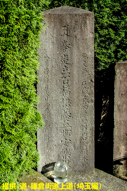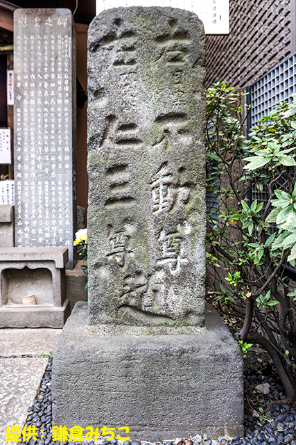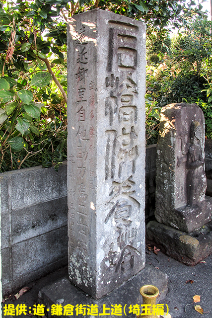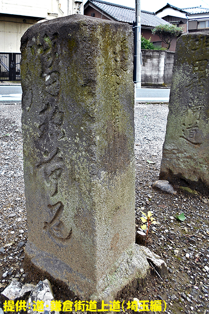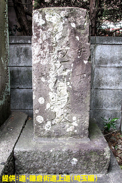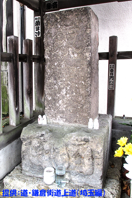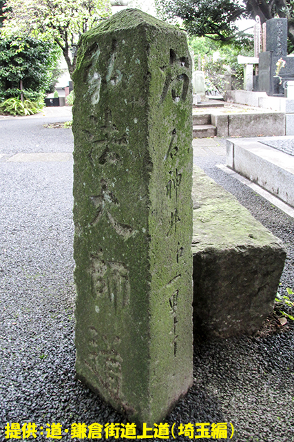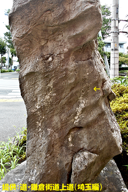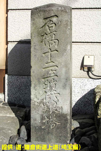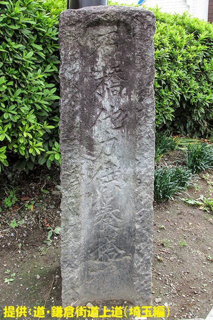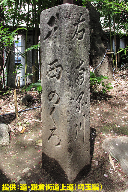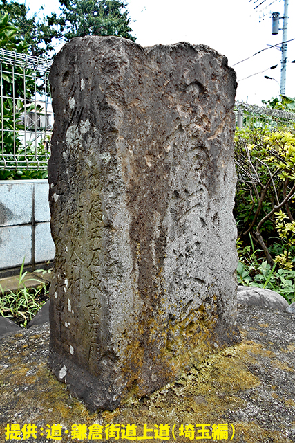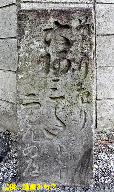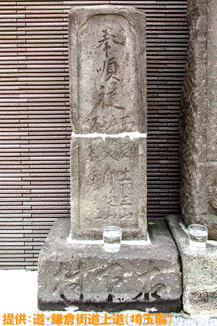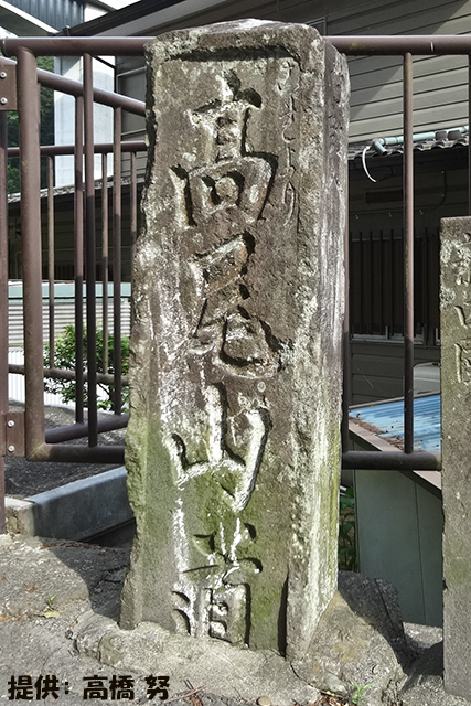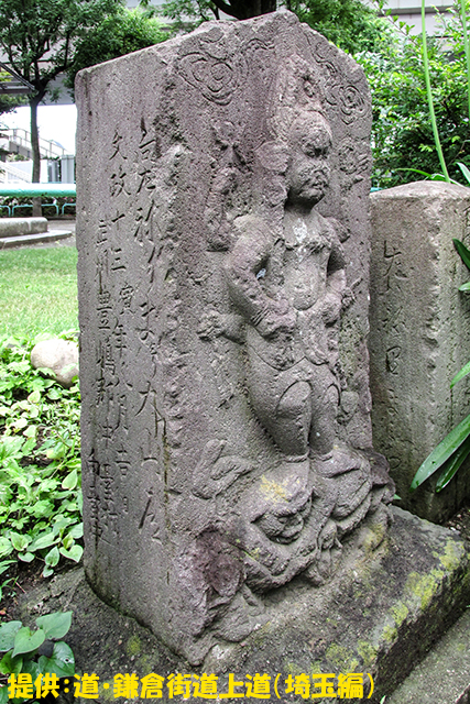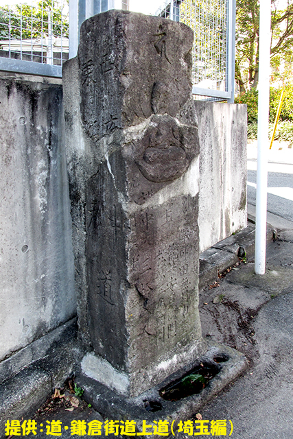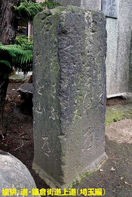 (正面像下右)「是ゟ…」、(同左)「不動院ヘヨシ」/正面上部にとぐろを巻いた蛇(弁財天の化身)の浮彫→上記の「大谷田の蛇体道標」と同一形 |