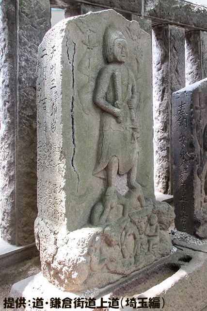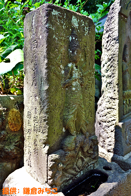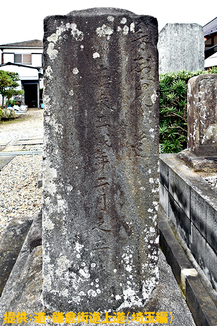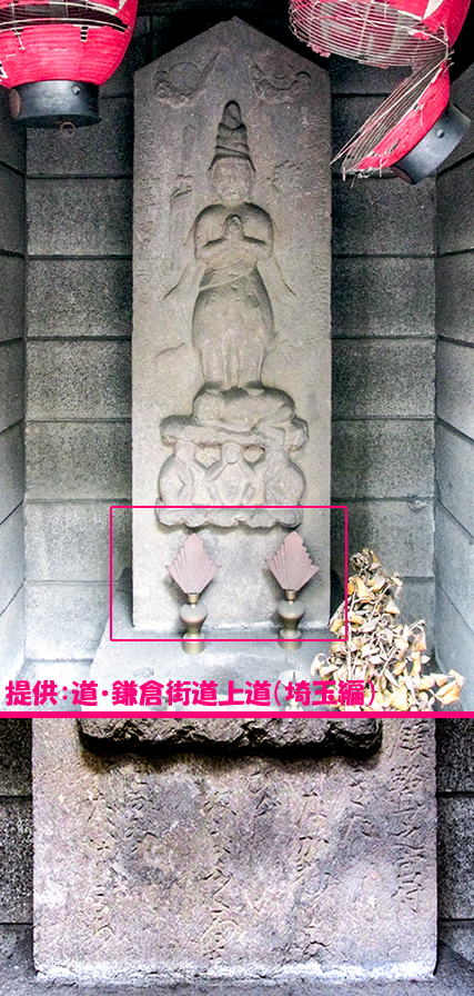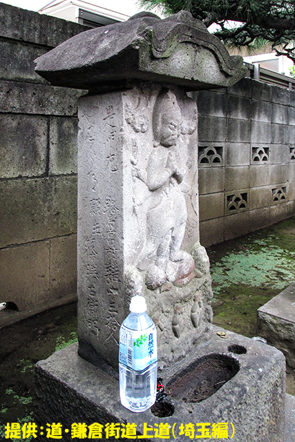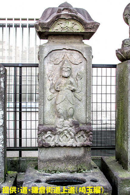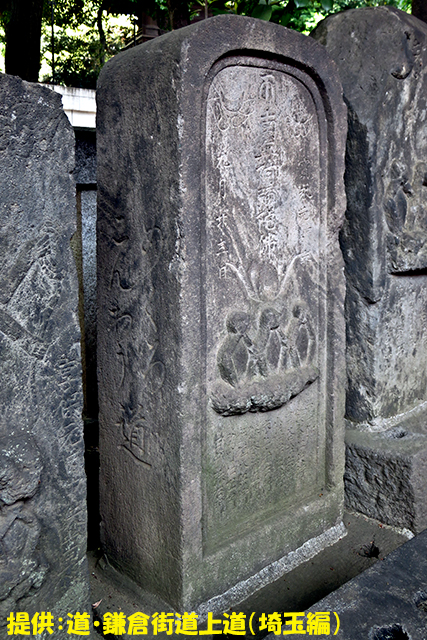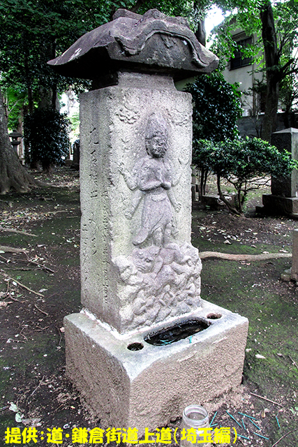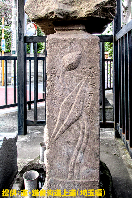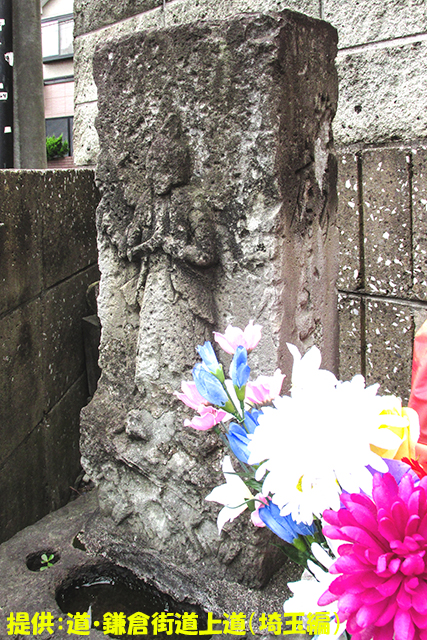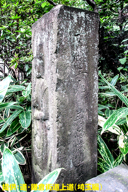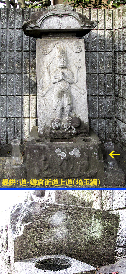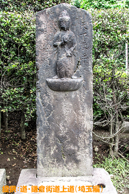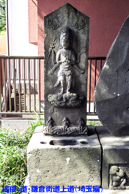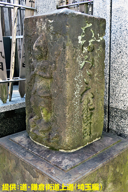 (右面最下部右)「向左 千住へ 一リ半」、(同左)「向右 草加へ 一リ半」/正面に青面金剛立像(日月、六手合掌、二鶏、邪鬼、三猿)の陽刻 |