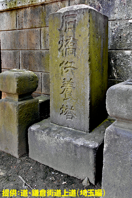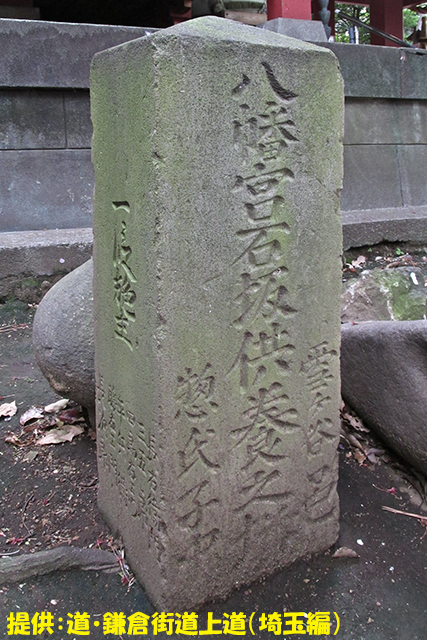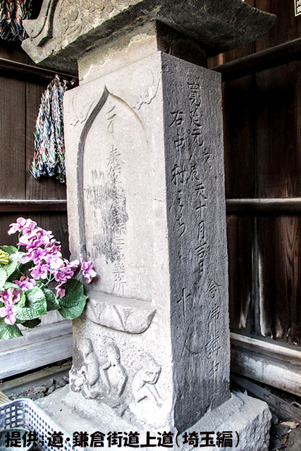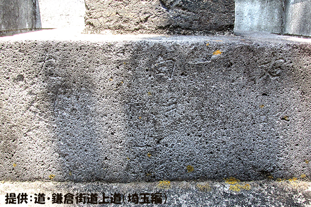 (上段台石正面)「北、宮寺/川越道」、(同右面)「西、髙根/二本木道」、(同左面)「東、登り 岸/八王子道」、(同裏面)「南、登り 村内/五ヶ市道」〔赤字は、資料によるもの〕/正面に「庚申塔」と陰刻 |