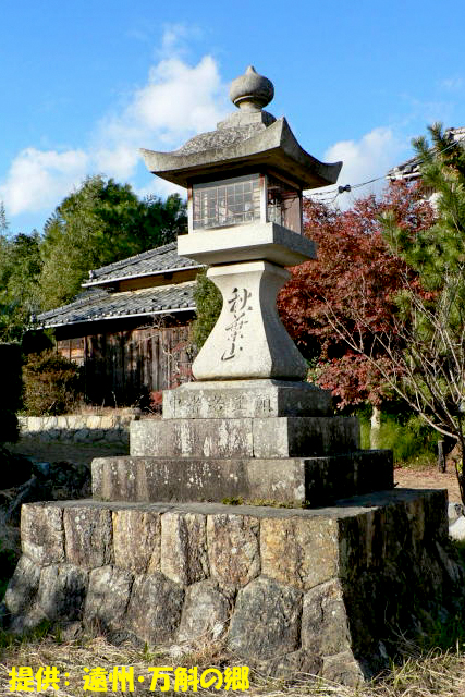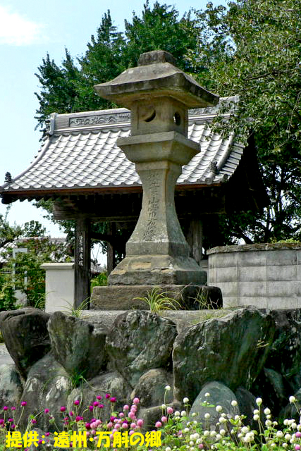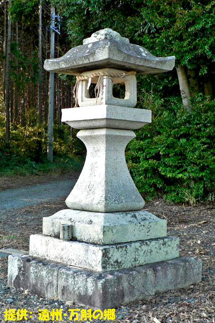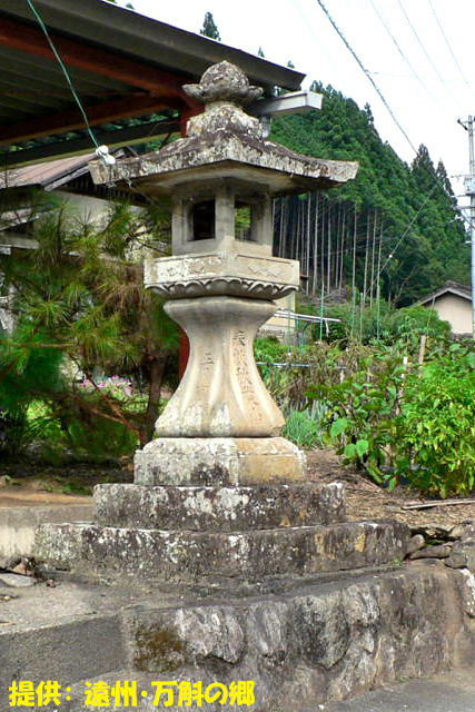 森町の鋳物師・岡野五良左衛門が青銅製の燭台を製作/鞘堂の妻部に立派な棟飾りと、懸魚(若葉・渦紋の透かし彫り)/青銅と鉄(台石は石円盤)で笠から台石まで完全に残る常夜灯は非常に稀/鞘堂付き秋葉山常夜灯は遠州・駿河だけにしか見られない地域的特徴 |
