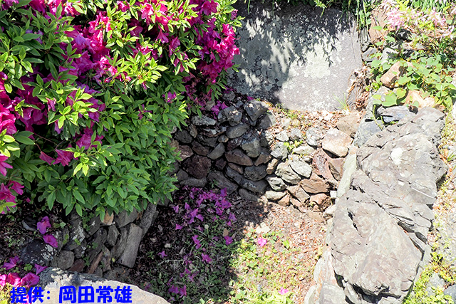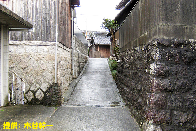 棚田、住居の間に土坡の一部に石垣が組まれ、ところどころに穴が開いている農業、生活用水路 |