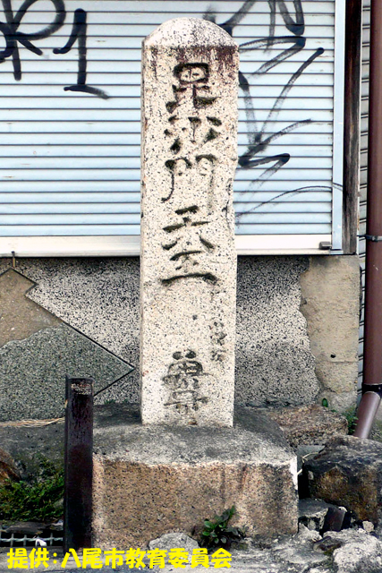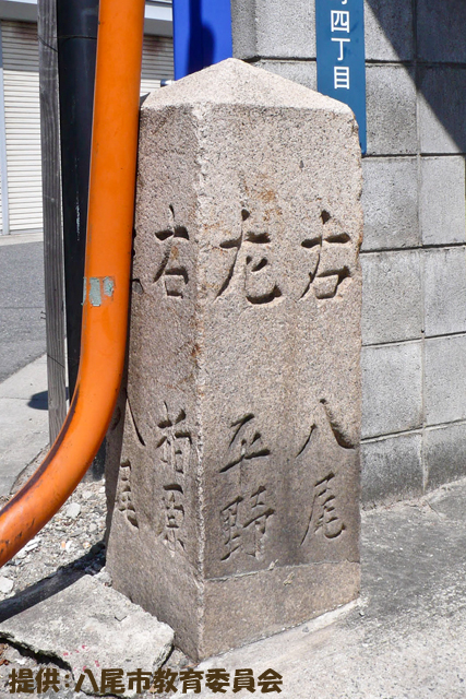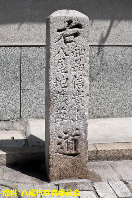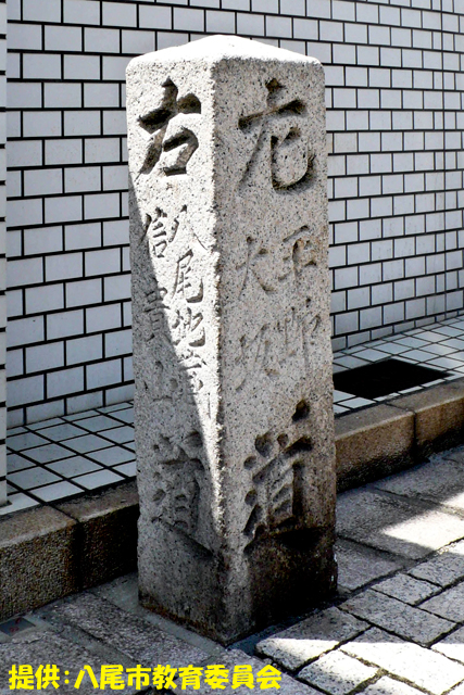 (正面)「右、八尾 久宝寺」、(同左端)「信貴山」、(裏面)「左 大阪」/長方形に削り込み文字を陰刻 |