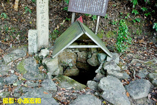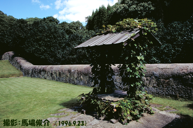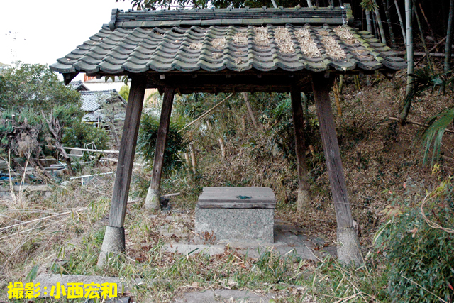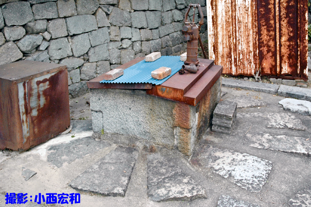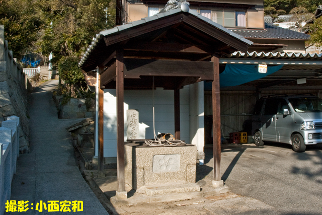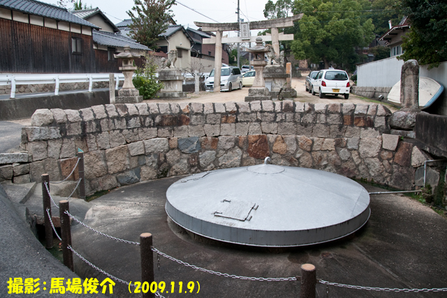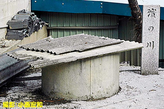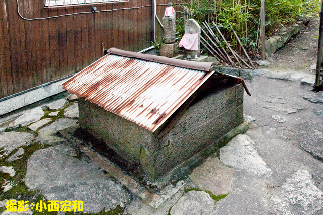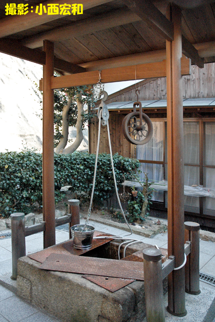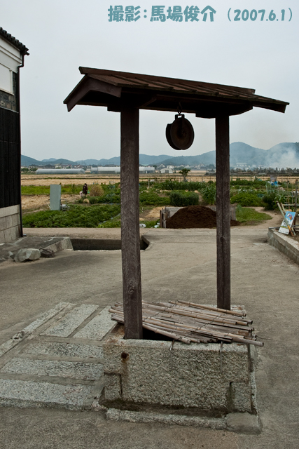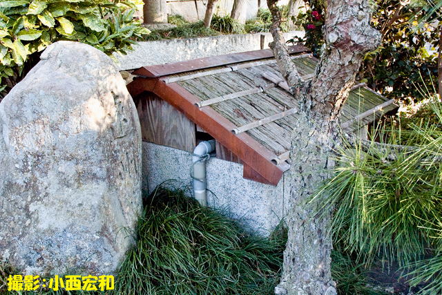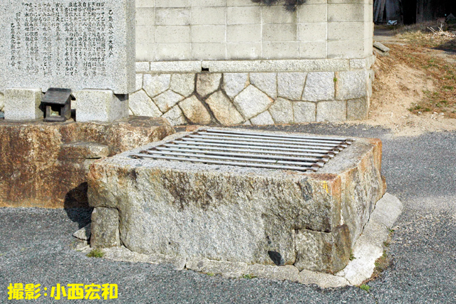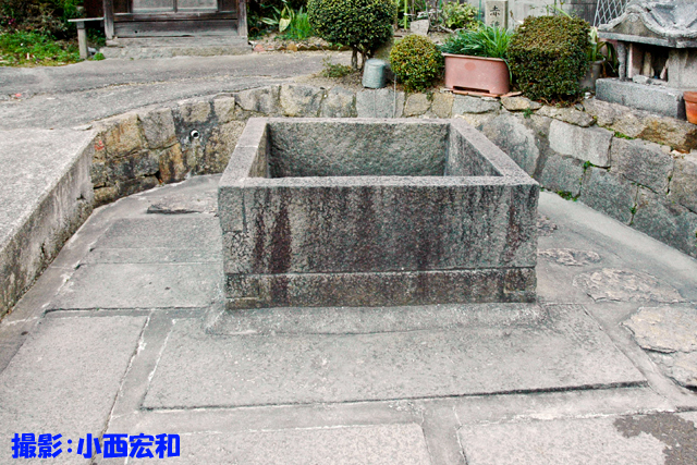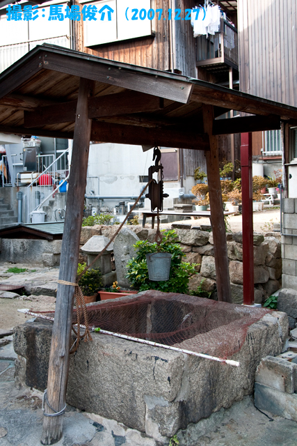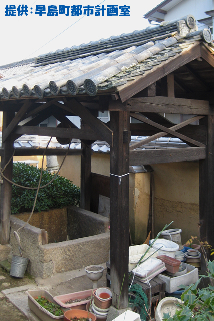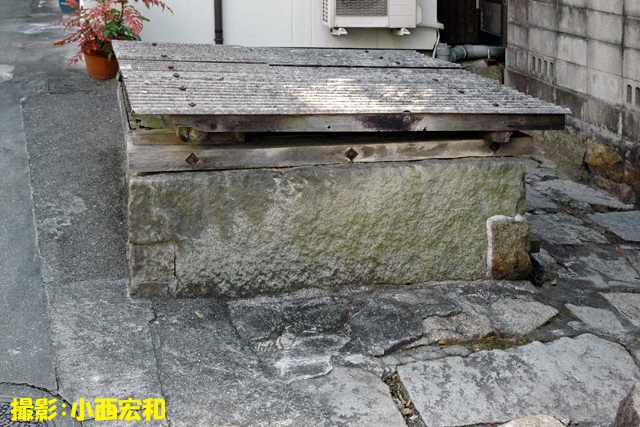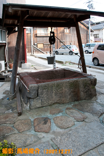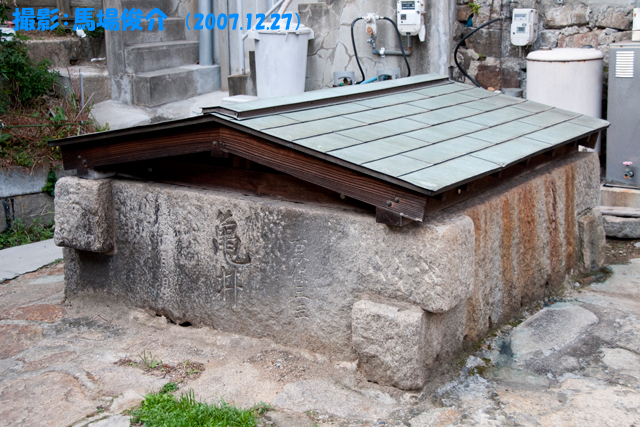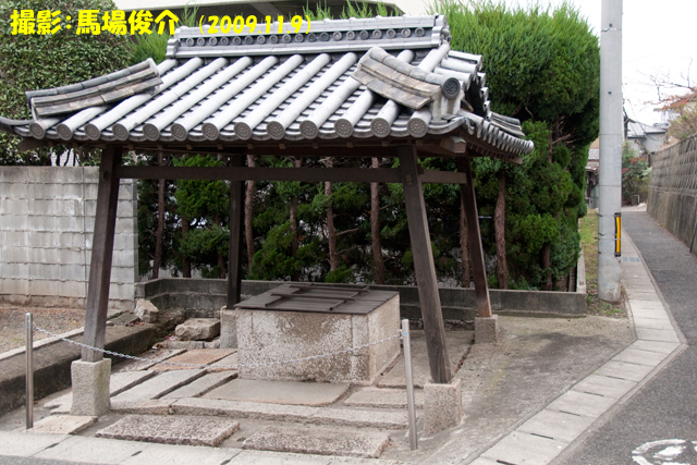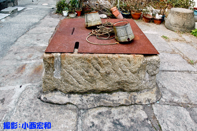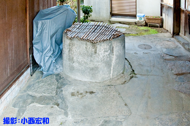 水を汲む側の面が14㎝低くなっている=珍しい構造(普通は4面とも同じ高さ)/井戸の屋根瓦に戸川の家紋 |