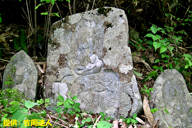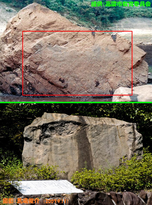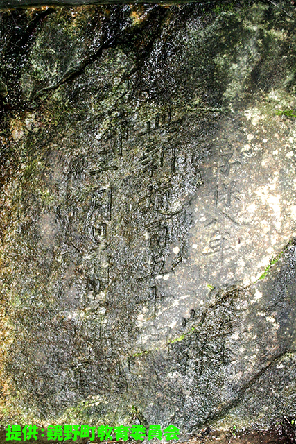川沿いの崖面の岩盤に直接文字を彫り込まれている→崖面はC補強され刻字部分のみ岩肌を残す |