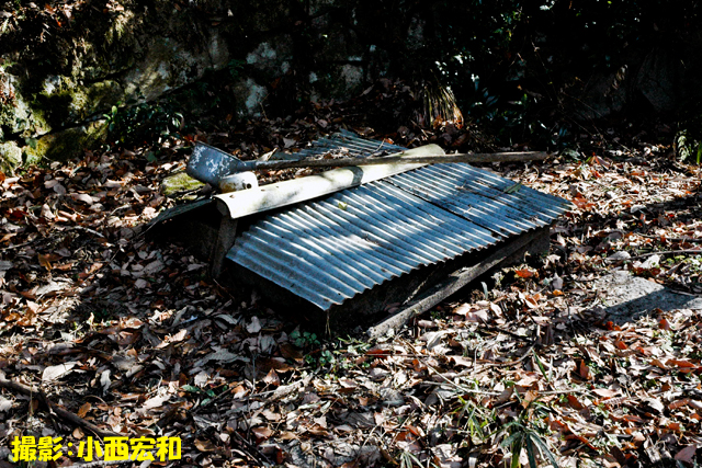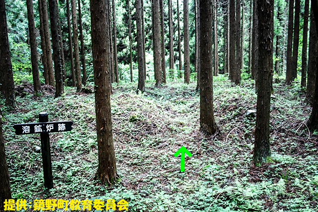 明治20代まで操業/山林中に一連の施設が残る(写真は高殿跡の窪み〔緑の矢印の先〕) |