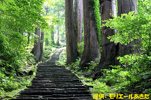 羽黒山中興の祖と言われる天祐別当が石階段と杉並木を一体的に整備/標高差約300m、2446段の石段の両側に樹齢300-600年の杉が立ち並ぶ(天祐別当の整備前から植えられていた杉もある)/「爺杉」は、樹齢1000年以上と推定されている