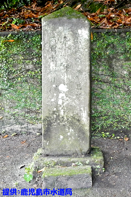 (正面中央)「水神」、(場所不明)「そもそも 此の御用水のはしめは 享保八癸卯のとし 御造初ありて あふけなくも 水筋の屋敷屋敷は 双方五尺かゝりの程 相当の料くたしおかれ 御用地になし置れけり 久しくなりゆくまゝに 人もいりかはり かのよしあるをもわきかね 薗の樹木はおのがじし 生茂り根さし長くはひいり なかれを戸さし もれ水多く いはんかたなく 仮初の御修甫にては なかなかならぬ気しきなれは このたひ 新刻石をもて 御城内まで七百四十間のあいだ御仕調あたらに水神を建立するものなり」(『鹿児島市水道史』p.34)