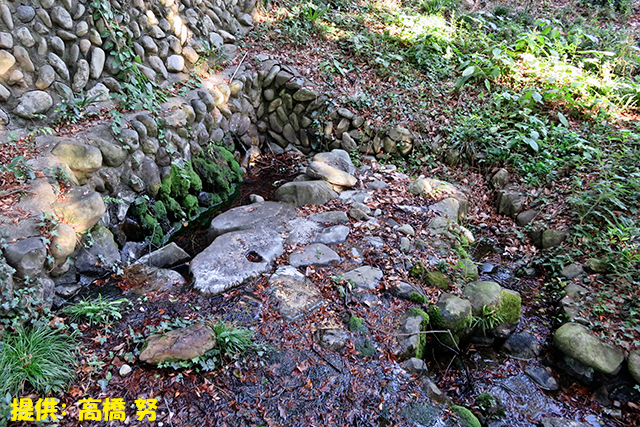 引水してきた水を、石積井戸から流下させる2つの取水溝と四角の「のぞき穴」がある |