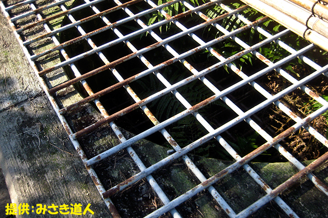 井戸本体が鉄パイプ傘と金網で覆われている |