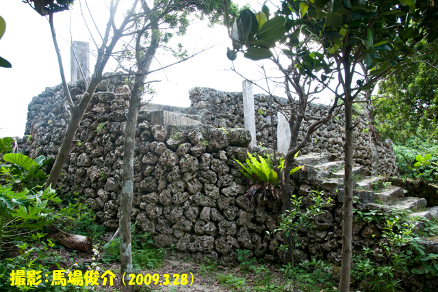 先島諸島の火番盛群/やや先細りの方型の石積台階段は、L字型についている